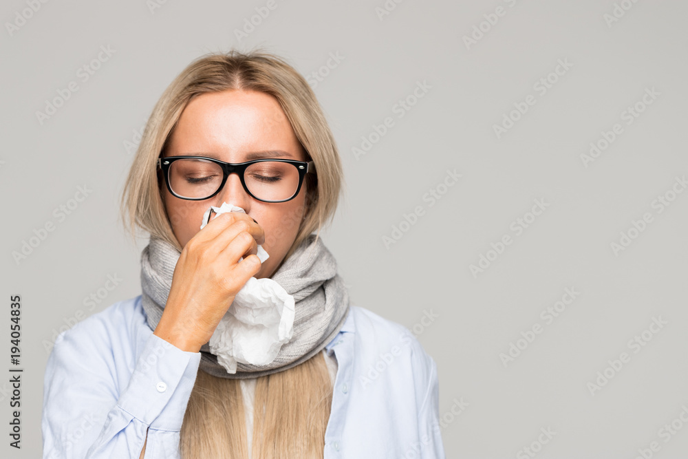Fotografie Beautiful upset young blond woman with glasses, shirt, wrapped scarf with napkin