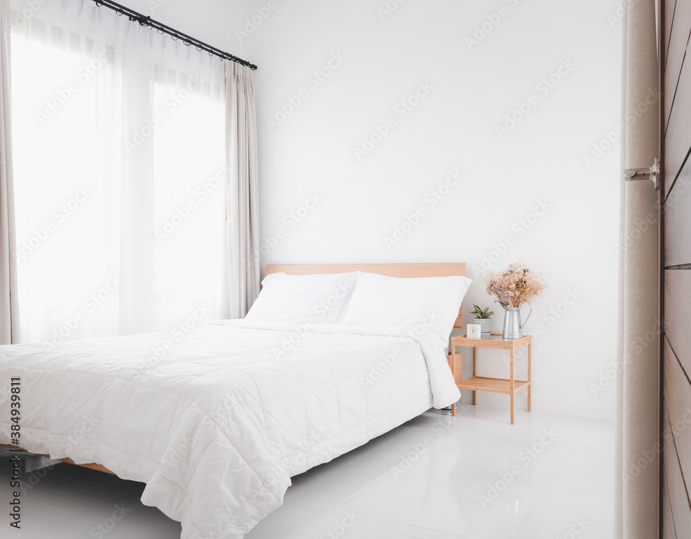 Fotografie Beautiful white clean cozy bedroom interior with green and dried flowerpot on si