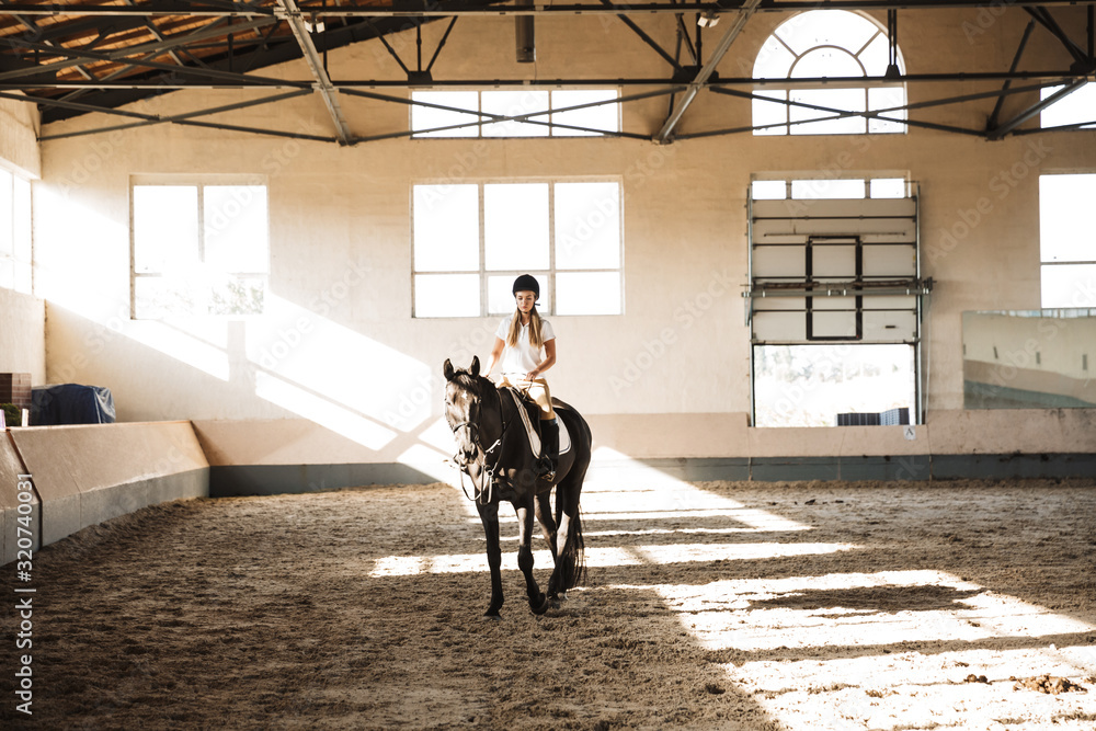 Obraz na plátně Beautiful woman wearing hat with horse