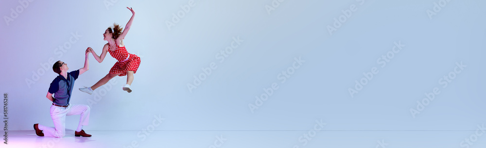 Fotografie Beautiful young couple, man and woman in stylish clothes dancing retro style dances over gradient blue purple studio background