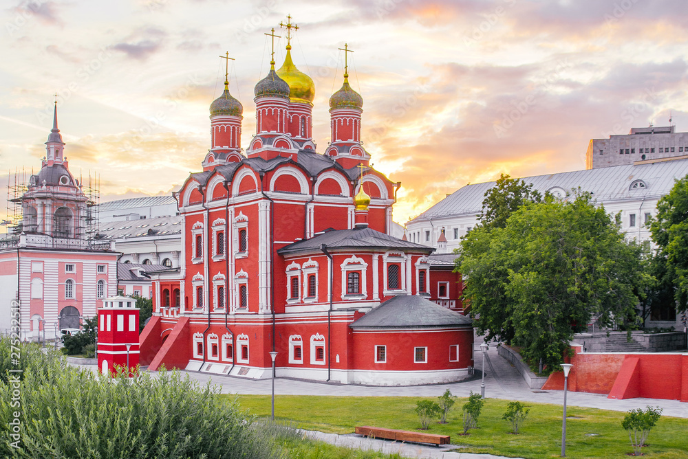 Obraz na plátně Beautiful Znamensky Monastery in Romanov Chambers area on Old Gosudarev (State) Yard on Varvarka street near Zaryadie Park in Moscow city on sunset