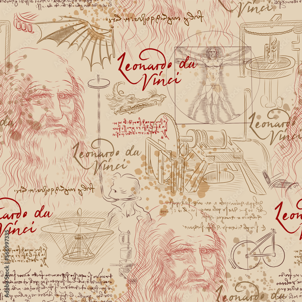 Fotografie BEIGE SEAMLESS VECTOR BACKGROUND WITH LEONARDO DA VINCI SKETCH DRAWINGS