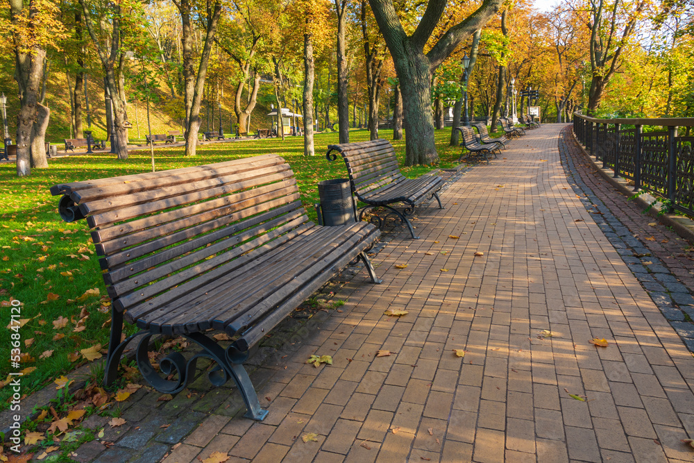 Fotografie Bench in the sunny autumn park.