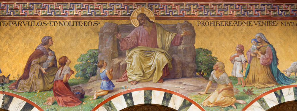 Fotografie BERLIN, GERMANY, FEBRUARY - 14, 2017: The Fresco of Jesus Christ among the children in Herz Jesus church by Friedrich Stummel and Karl Wenzel from end of 19