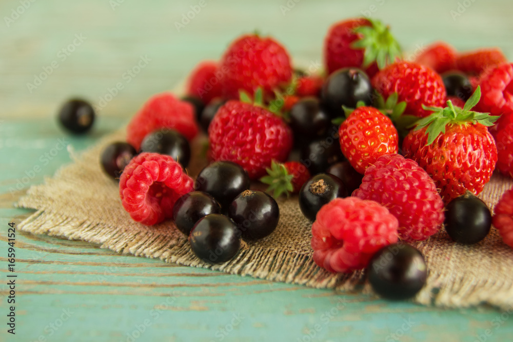Fotografie Berry of strawberries, raspberries and blackcurrants on the napkins from sackcloth on the blue-white wooden background