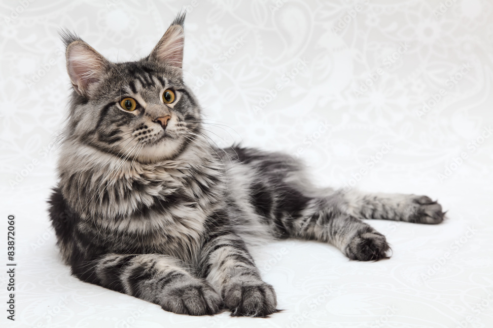 Obraz na plátně Big black tabby maine coon cat posing on white background