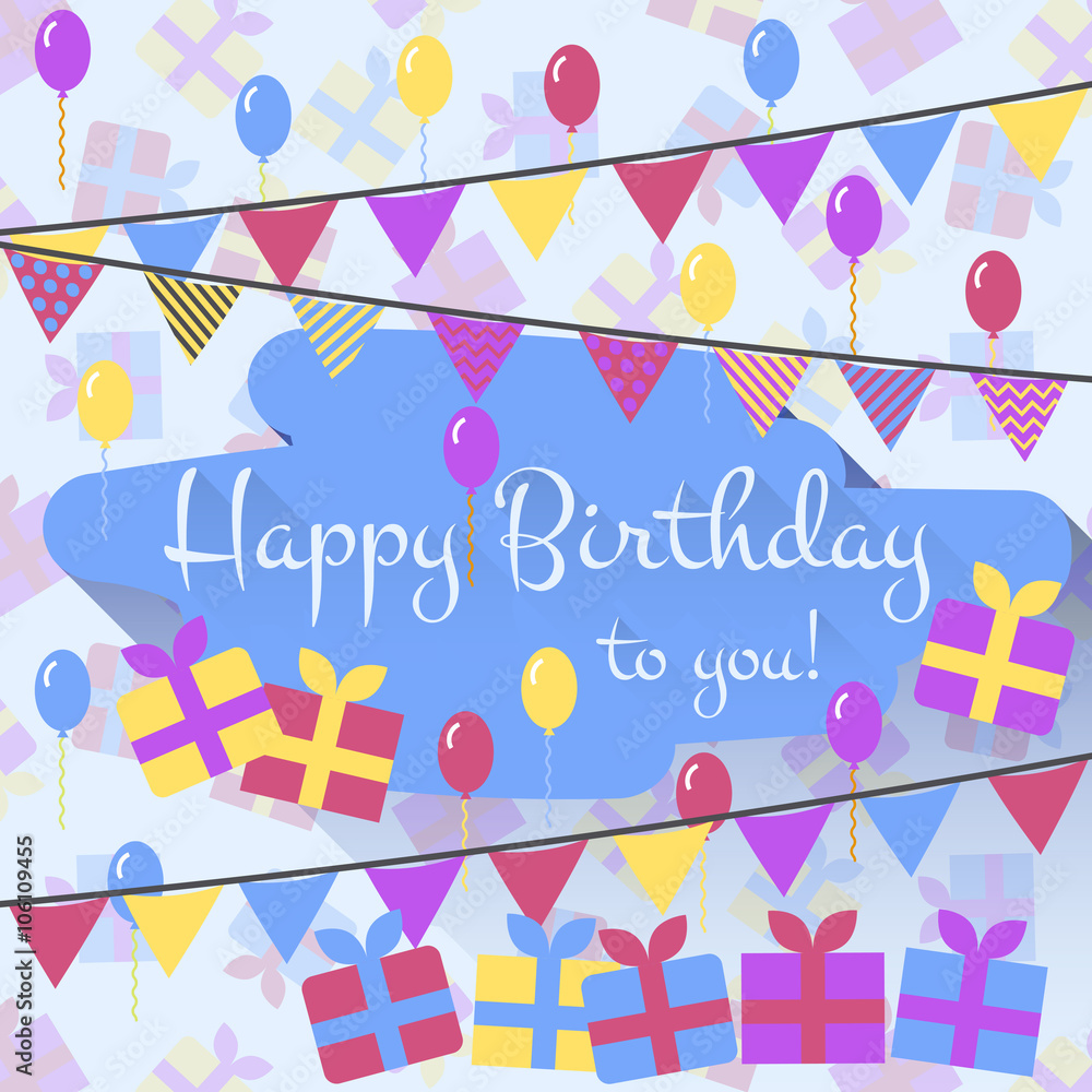 Fotografie Birthday card with balloons, gifts and garlands in flat style on pale blue background with gifts