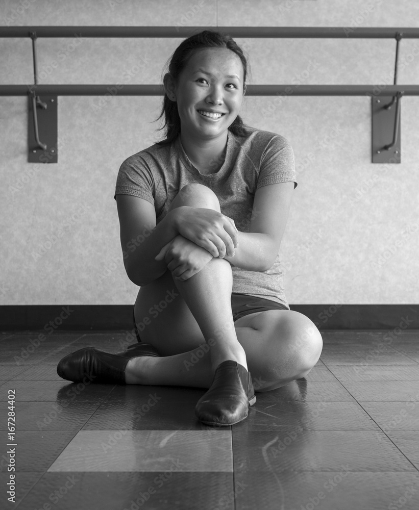 Samolepka Black and white version of Smiling Teenage Jazz dancer in dance class