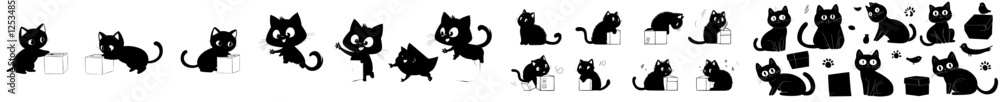 Fotografie Black cats play with cardboard boxes, plastic, and shopping bags