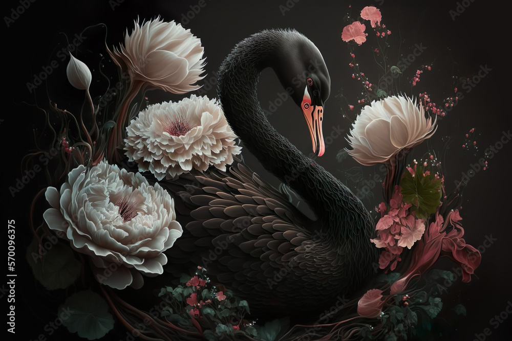 Fotografie Black swan, flowers. Digital art AI