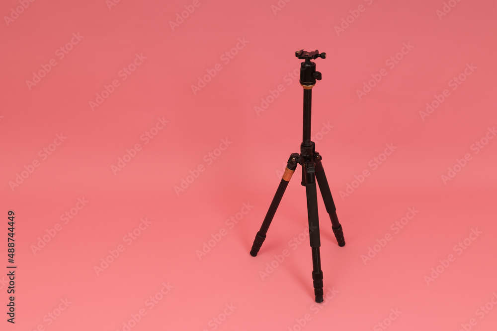 Fotografie black tripod for camera on pink background with copy space