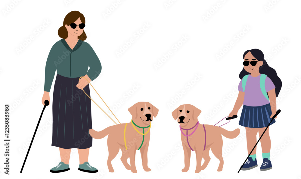 Obraz na plátně Blind woman and little girl with theirs dog guide walking outside