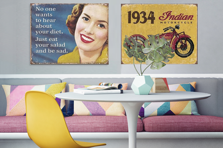 Asi největšími symboly retra jsou herečky Marilyn Monroe a Audrey Hepburn společně s Elvisem a Jamesem Deanem. Tyto osobnosti jsou v interiérech oblíbené dodnes a budou se hodit i k vám! Kromě známých osobností si lidé věšeli na zdi také plakáty oblíbených filmů a kapel jako byli například Beatles či Beach boys. V neposlední řadě byla oblíbená dobová auta, reklamní slogany a módní pin-up girls. Konzum totiž vládl světem a umění se využívalo hlavně pro reklamu. Máte-li hodně rádi zářivé barvy, doporučujeme vám zavítat i do naší kolekce Popartová senzace! Najdete tam obrazy a fototapety inspirované Andy Warholem či Royem Liechtensteinem.
