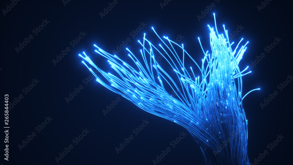Fotografie blue fiber optic glass strings glowing in dark. 3d illustration