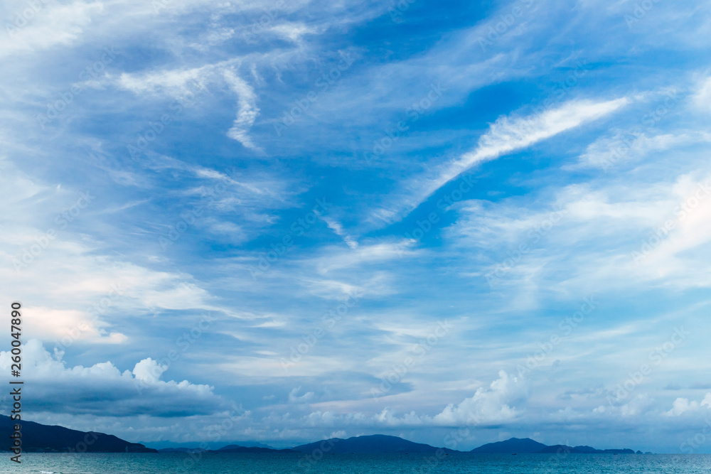 Fotografie Blue sky with white clouds over the sea and mountains, wonderful landscape