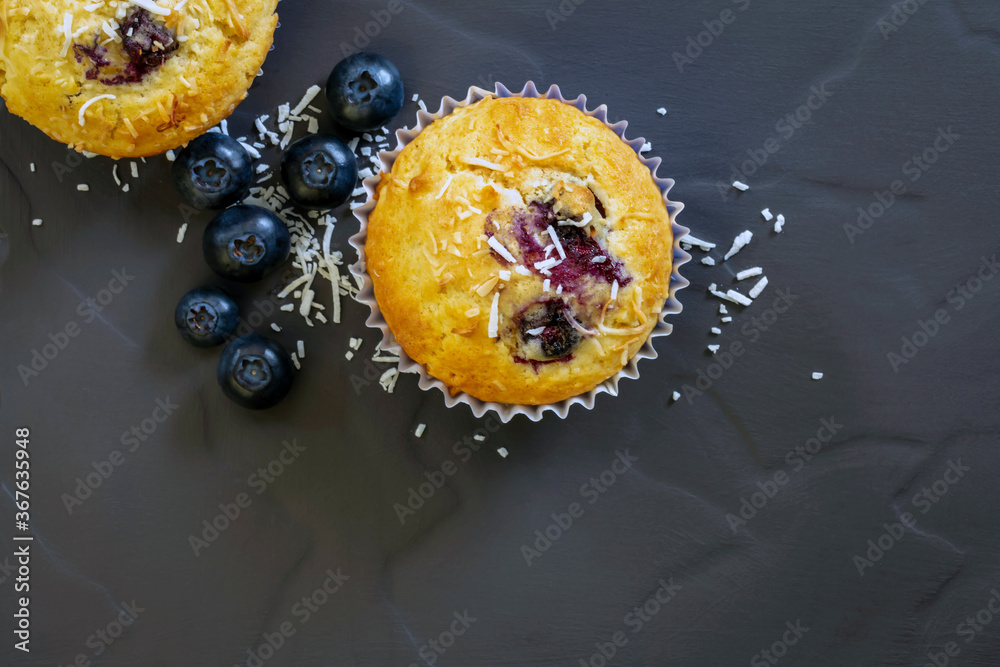 Fotografie Blueberry and Coconut Muffins Top View on Dark Slate