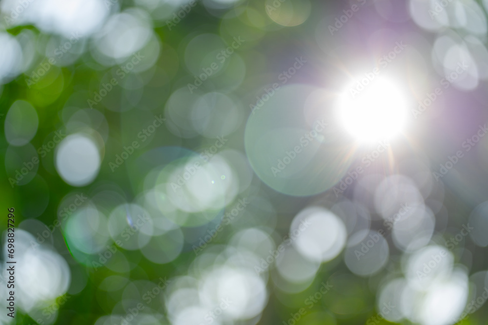 Fotografie Blur green bokeh with light flare outdoor natural garden, Green natural garden Blur background