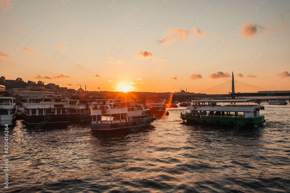 Fotografie Boats in sea with sunset sun and Golden horn metro bridge at background, Istanbu