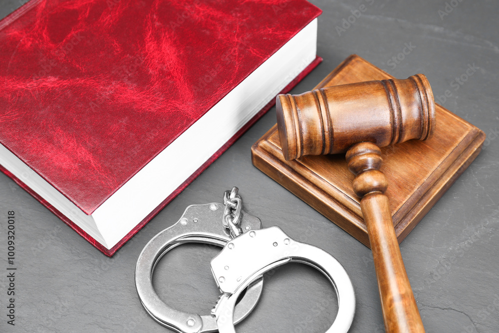 Fotografie Book, judge's gavel and handcuffs on gray textured table