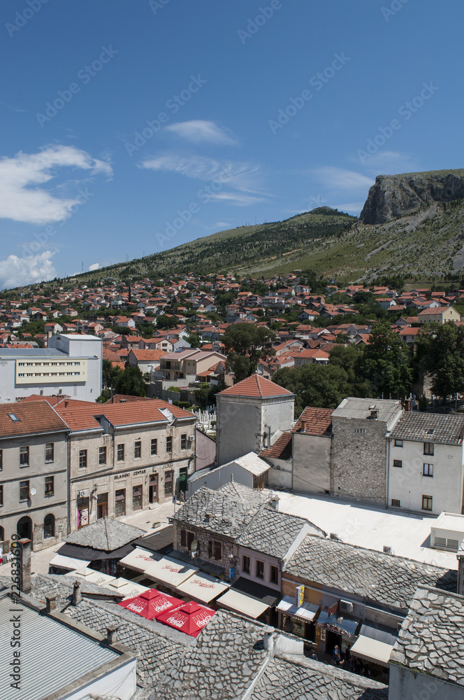 Fotografie Bosnia: lo skyline di Mostar visto dai tetti della città vecchia con vista dei m