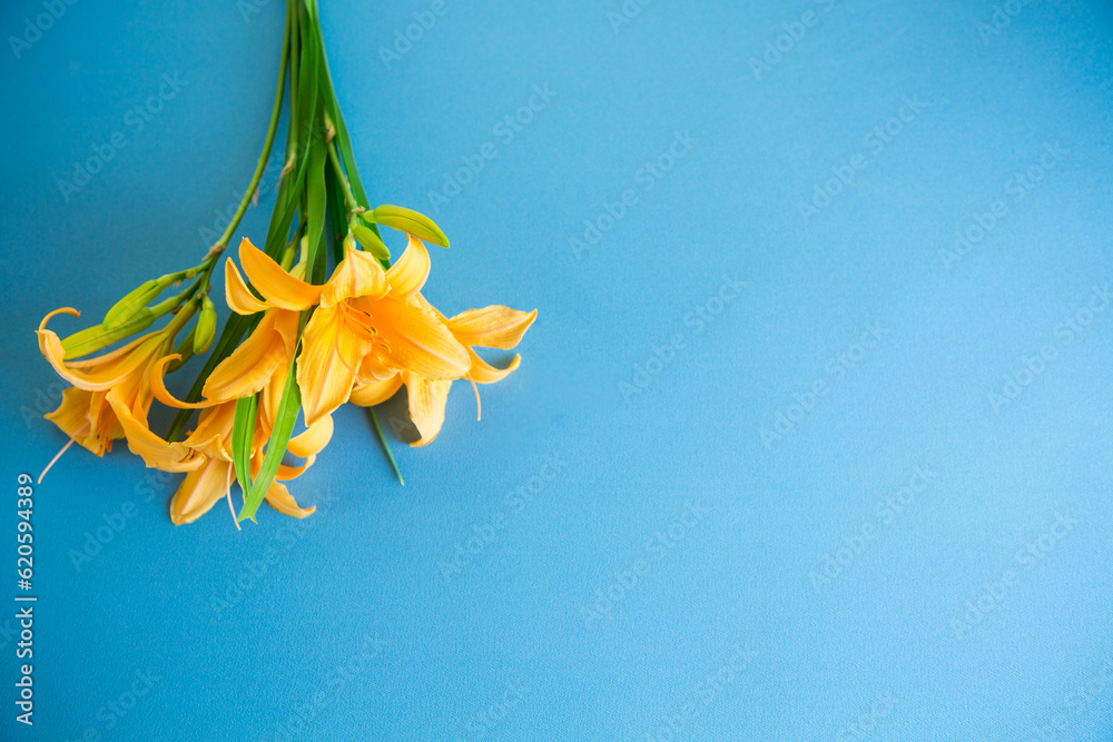 Fotografie bouquet of beautiful yellow lilies on blue background