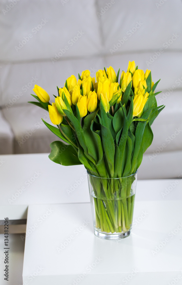 Fotografie Bouquet of yellow tulips in a glass vase at home