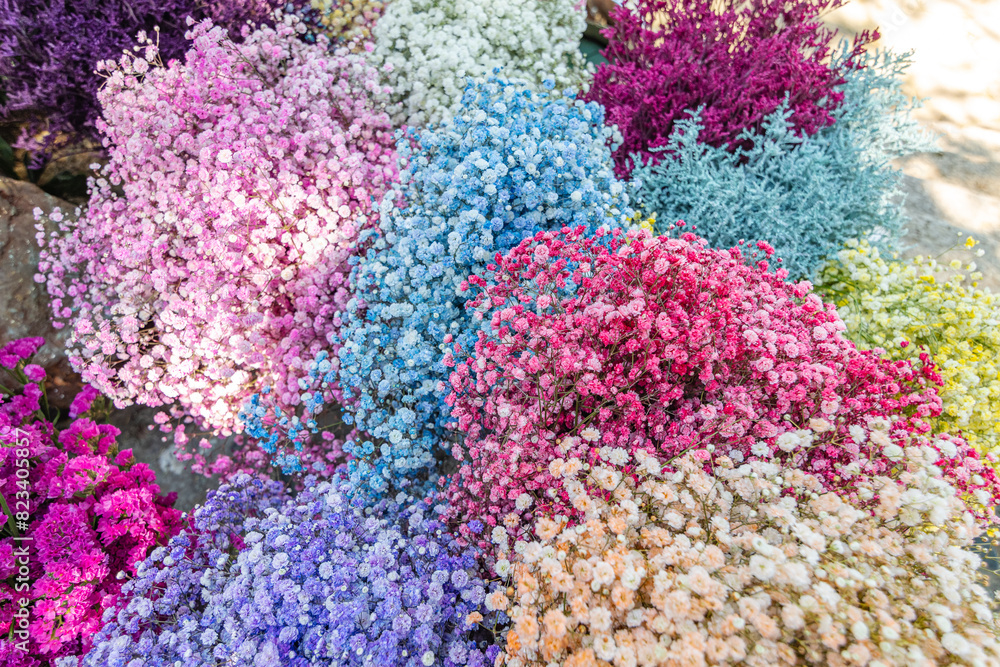 Fotografie Bouquets de gypsophile de différentes couleurs.