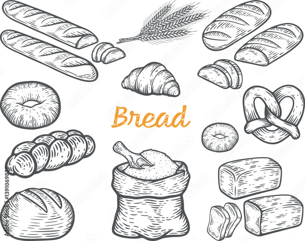 Fotografie Bread set fresh bakery pastry baguette brick loaf whole cut rye sourdough white