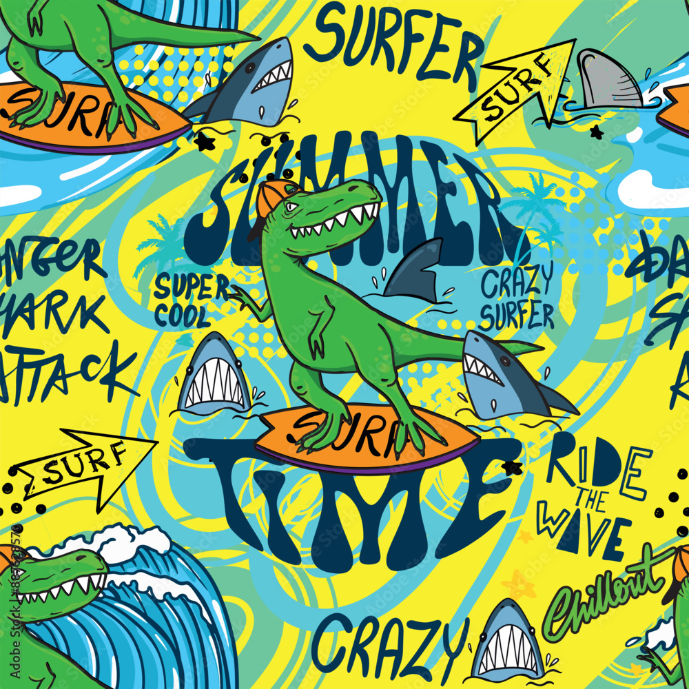 Obraz na plátně Bright cool seamless pattern with dinosaur on a surfboard