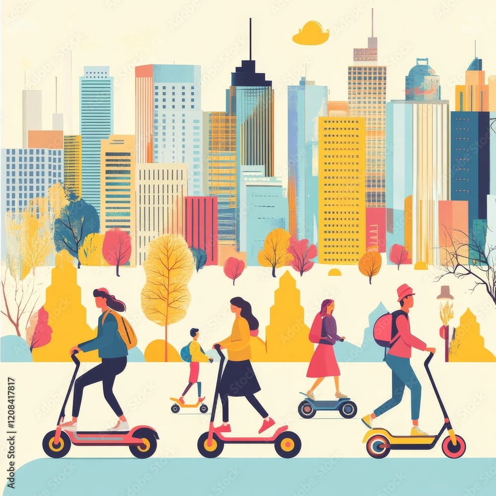 Fotografie Bright infographic style cityscape, diverse people riding e-scooters safely, che