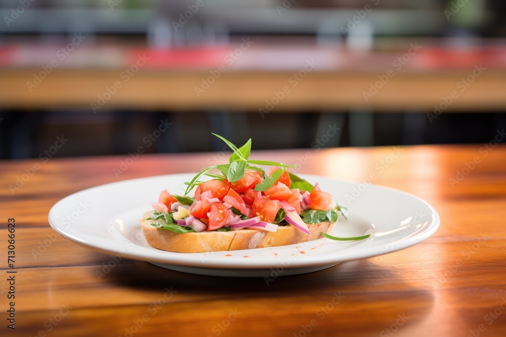 Fotografie bruschetta with a topping of tomato, basil, and red onion on a glass plate