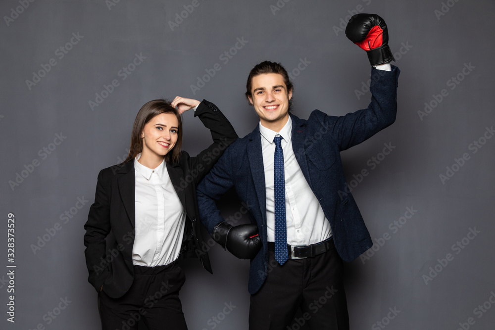 Fotografie Business man with boxing gloves with a young business woman isolated on gray bac