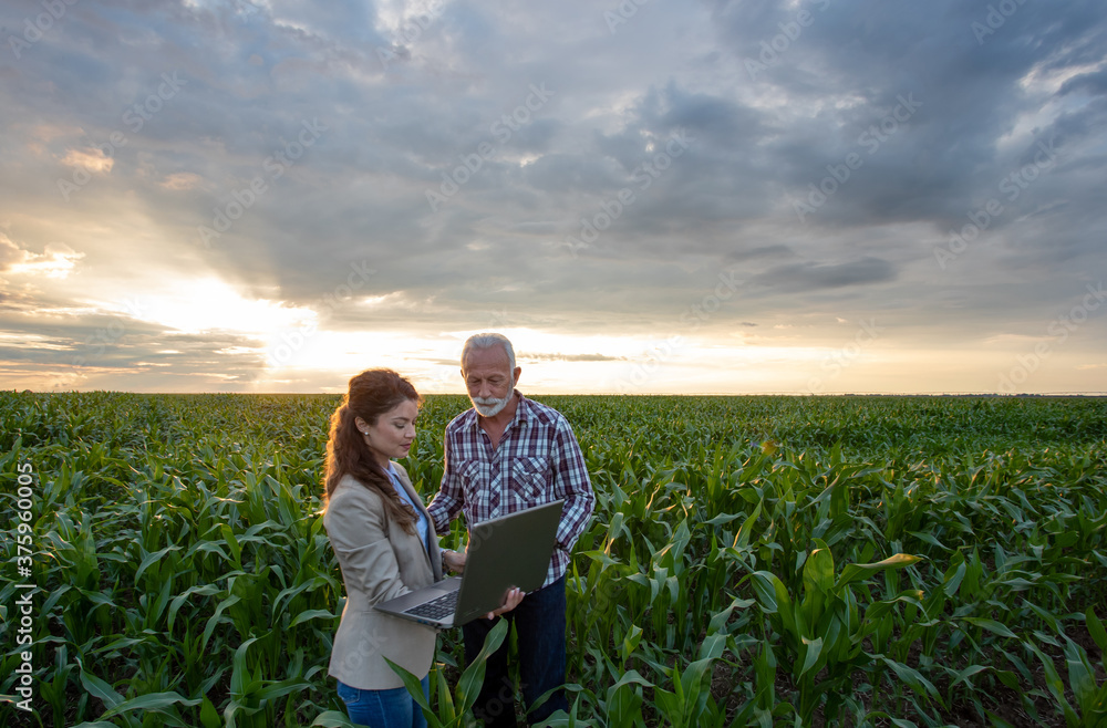 Obraz na plátně Business woman and senior farmer with laptop in field