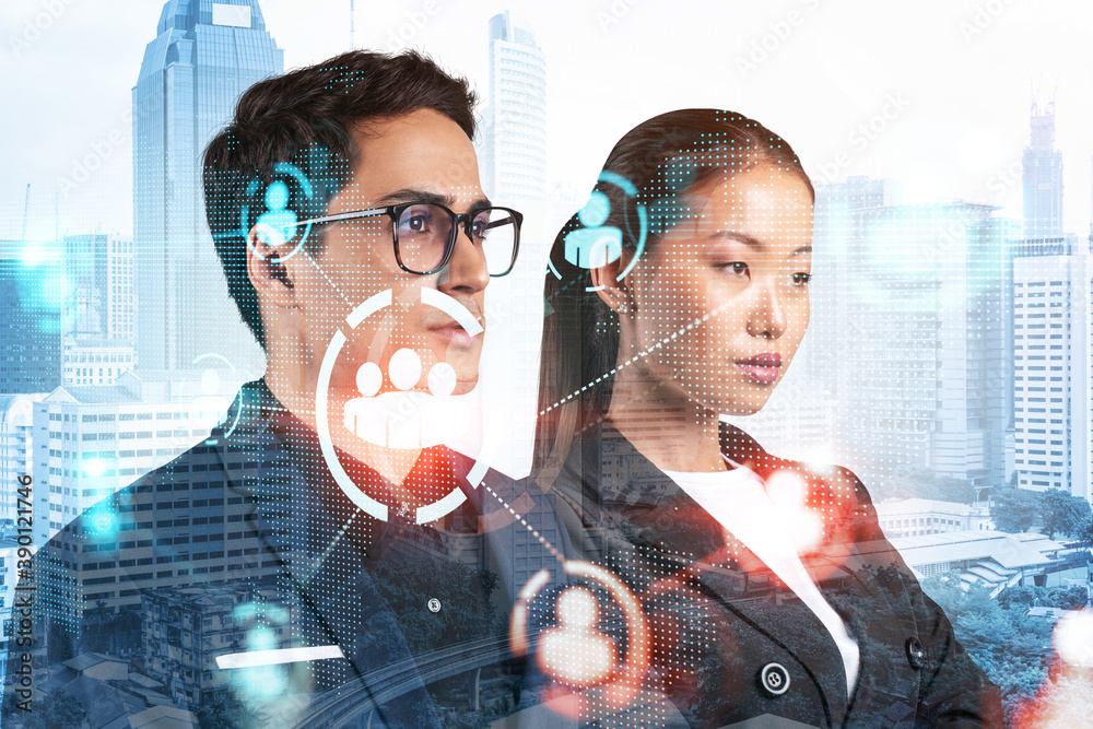 Fotografie Businessman and businesswoman as a SMM specialists thinking about development of social media marketing strategy to achieve business goals