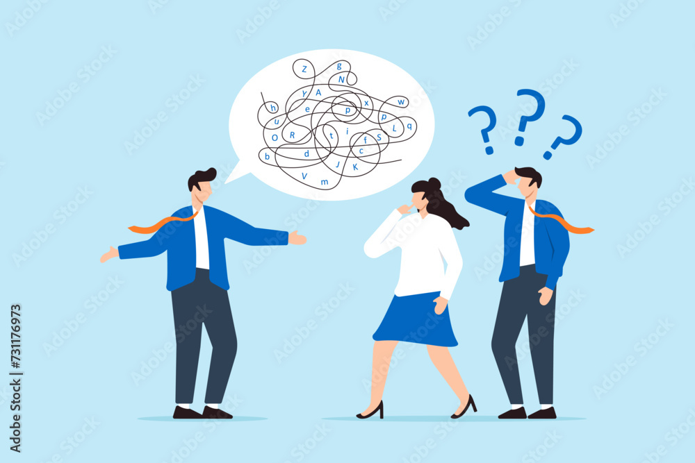 Fotografie Businessman confuse others with jargon in speech bubble dialogue