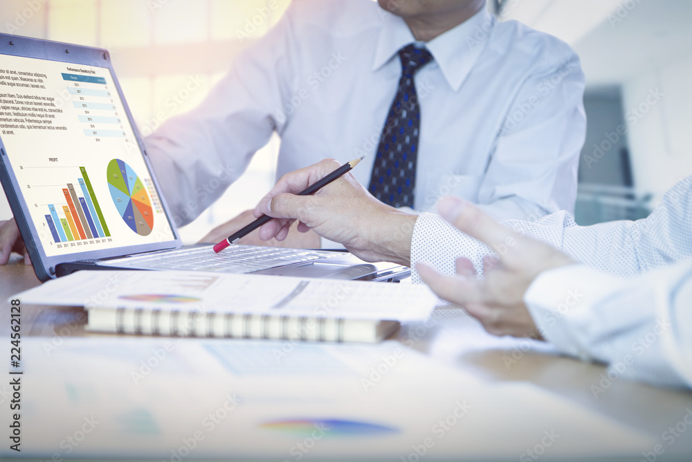Fotografie Businessmen in an office meeting review and discuss on business performance and return on investment or investment risk analysis with colourful graphs in a laptop computer notebook