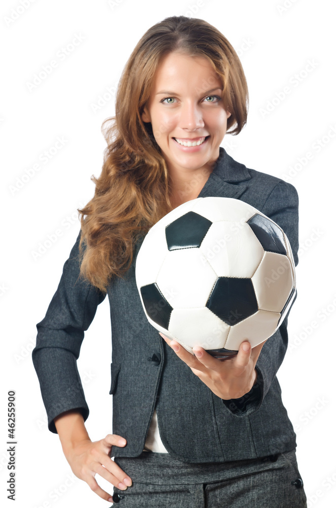 Fotografie Businesswoman with football on white