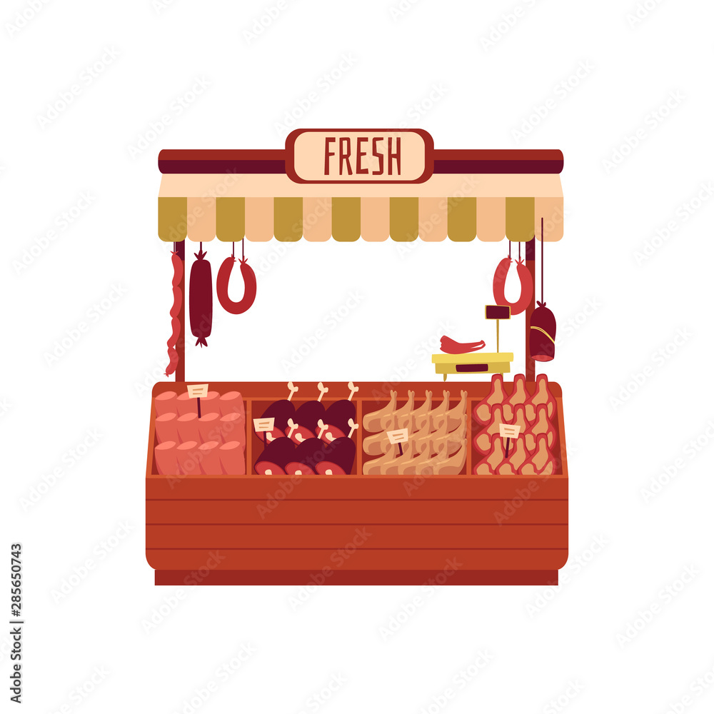 Fotografie Butchers shop or street marketplace with meat flat vector illustration isolated