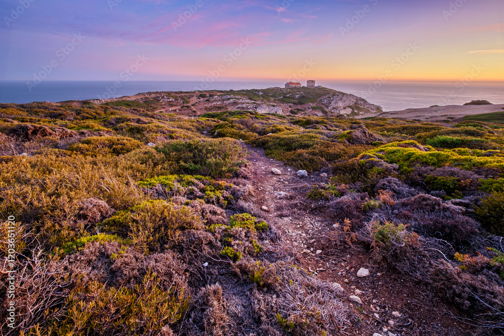 Fotografie Cabo Espichel cape Espichel on Atlantic ocean at sunset with ruins