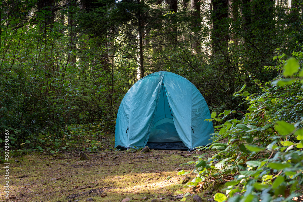 Fotografie Camping in Humboldt County, California, USA, in a blue iglu tent