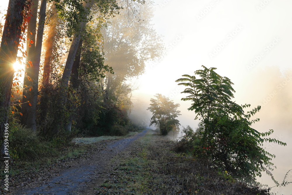 Obraz na plátně Canalside trail disappears into the fog at sunrise