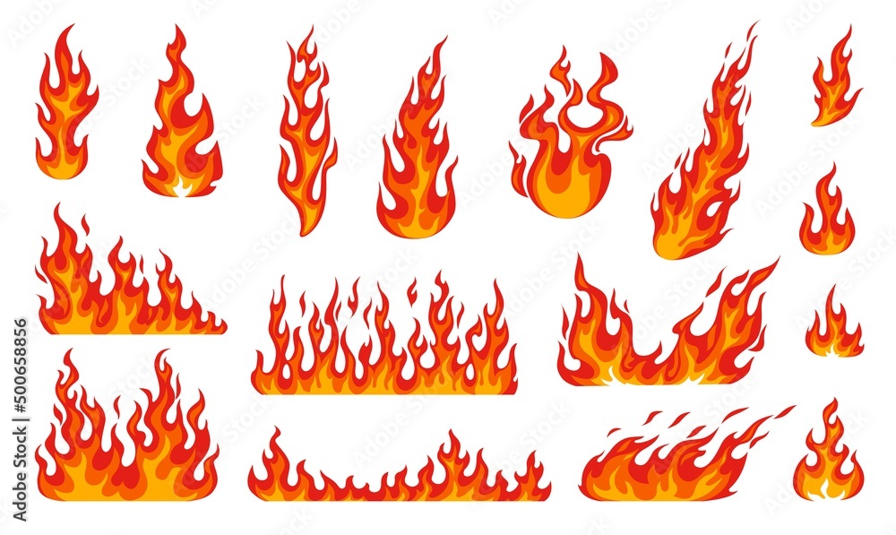 Obraz na plátně Cartoon fire flames, bonfire fire and burning fireballs, vector icons set