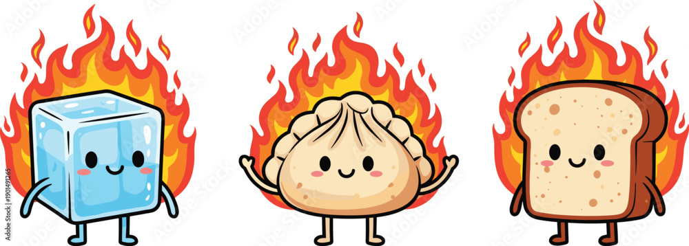 Obraz na plátně Cartoon food on fire ice cube dumpling bread flames