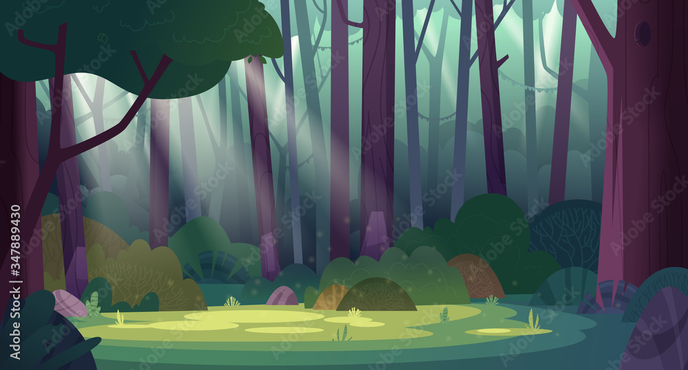 Fotografie Cartoon magic summer jungle forest glade with sunbeams