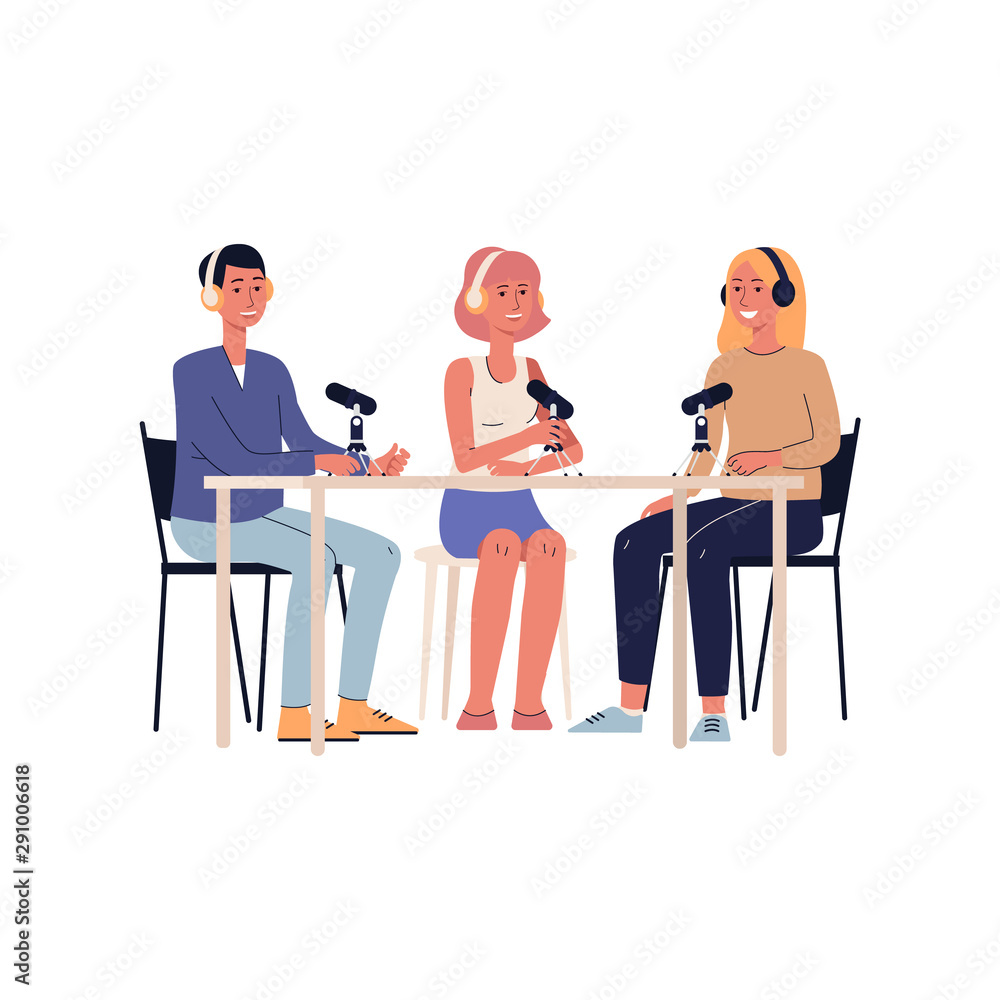 Fotografie Cartoon people recording a podcast or radio show - happy young man and women