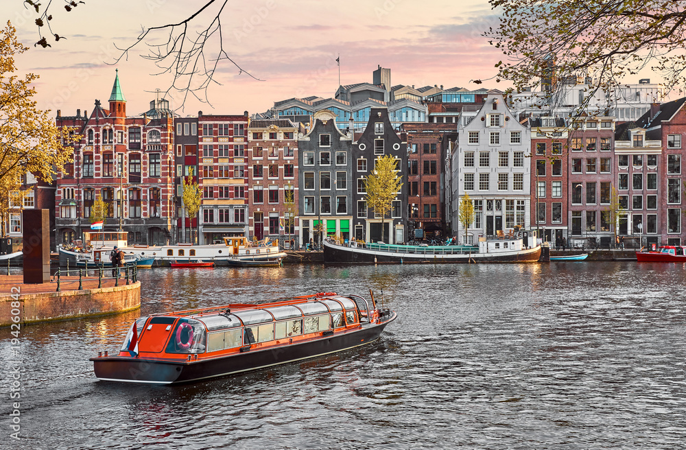 Obraz na plátně Channel in Amsterdam Netherlands houses river Amstel landmark