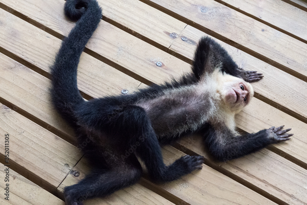 Fotografie Cheeky white-faced capuchin monkey (Cebus imitator) signalising capitulation in