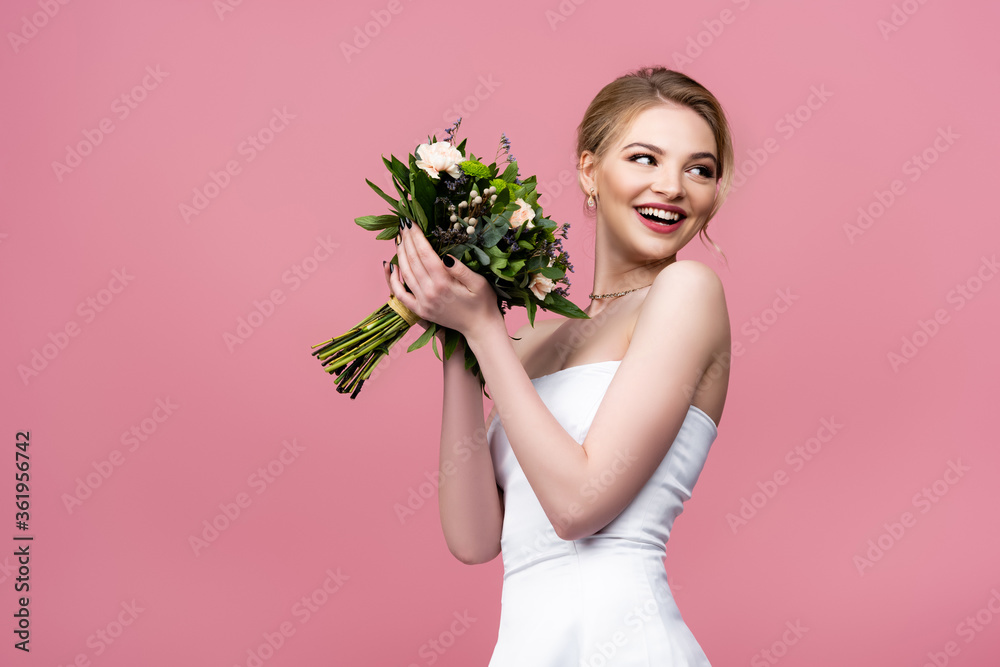Fotografie cheerful girl in white wedding dress holding flowers and looking away isolated o