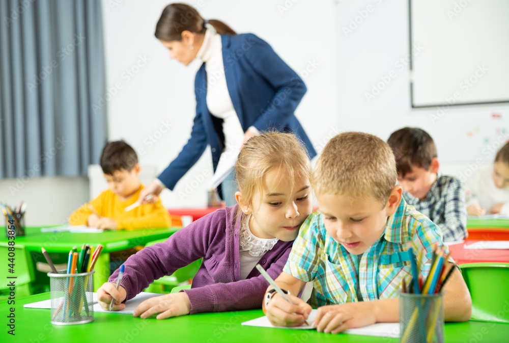 Fotografie Cheerful pupils chattering while sitting at lesson in elementary school