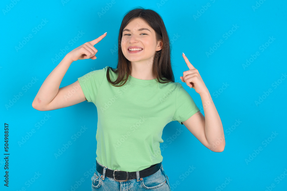 Fotografie Cheerful young beautiful Caucasian woman wearing green T-shirt over blue wall de